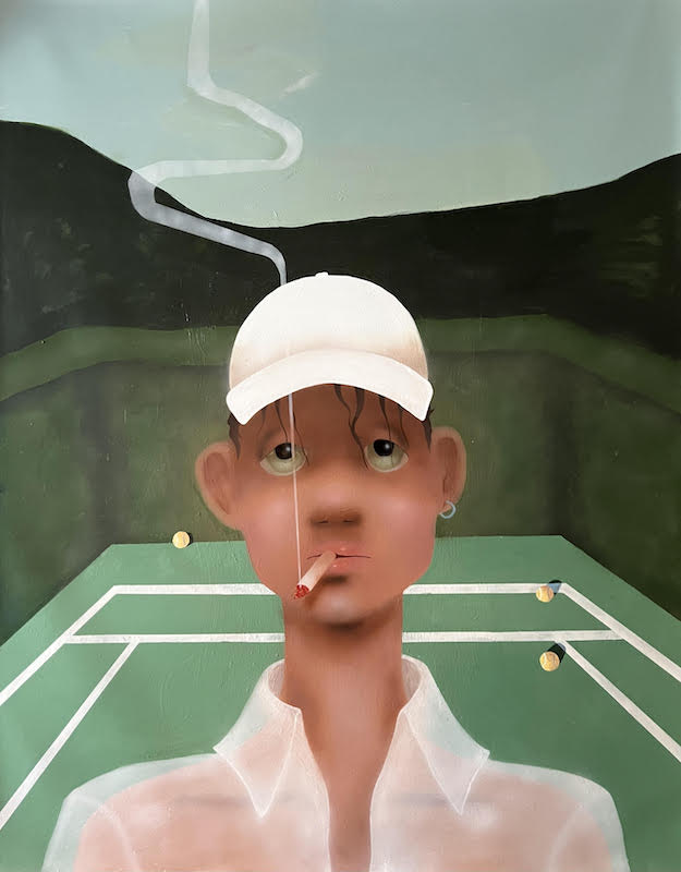At once playful and plaintive, the ascendant painter’s cartoonish rendition of a tennis match gone awry captures a scenic snapshot of sun-soaked …